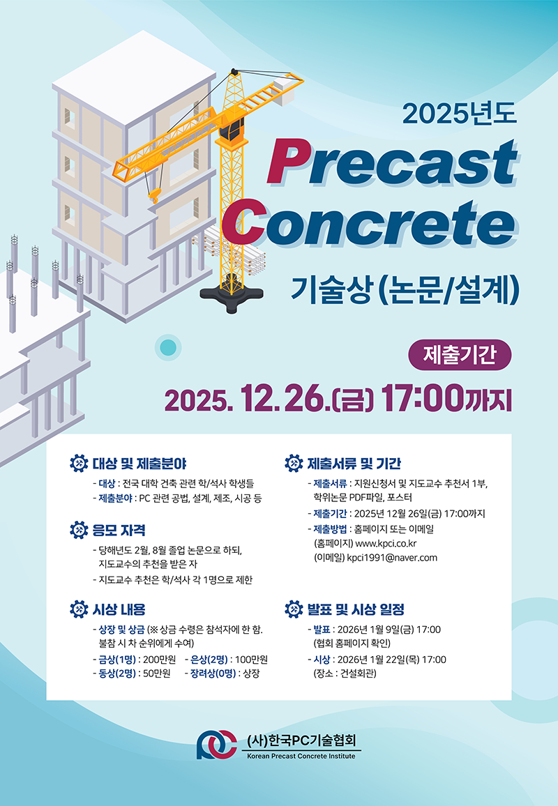 (사)한국PC기술협회에서는 국내 PC 산업계의 발전과 젊은 학문 후속세대의 PC 건설산업에 대한 관심 고취와 사기 진작을 위해 다음과 같이 PC 기술상 (논문상 및 설계상)을 시상하고자 합니다.